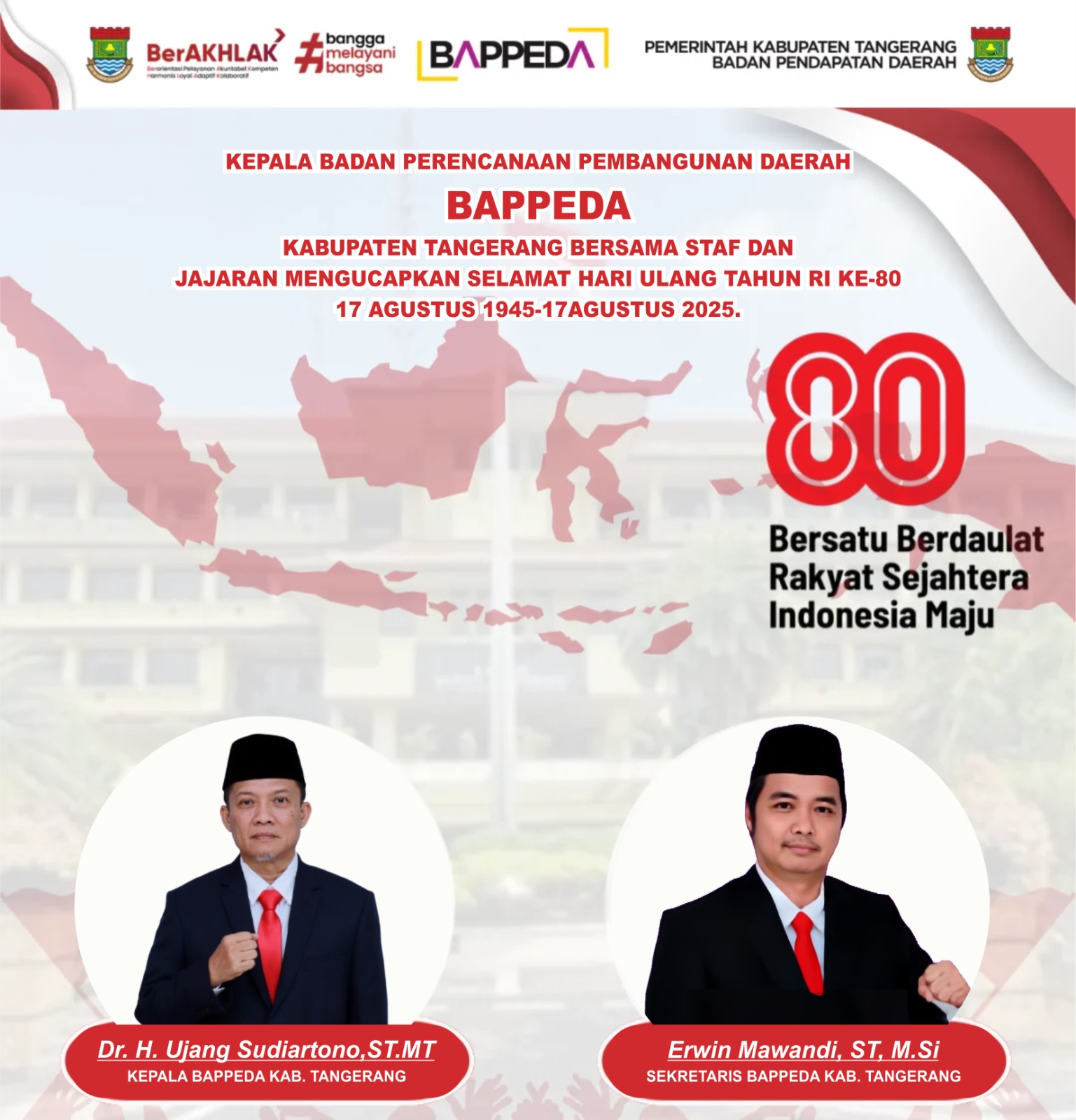 Kepala Badan Perencanaan Pembangunan Daerah (Bappeda) Kabupaten Tangerang Bersama Staf dan jajaran mengucapkan Selamat Hari Ulang Tahun 17 Agustus 1945 – 17 Agustus 2025.