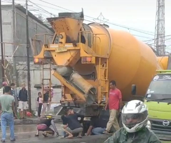 Pengandara Motor masuk kolong mobil truk molen.